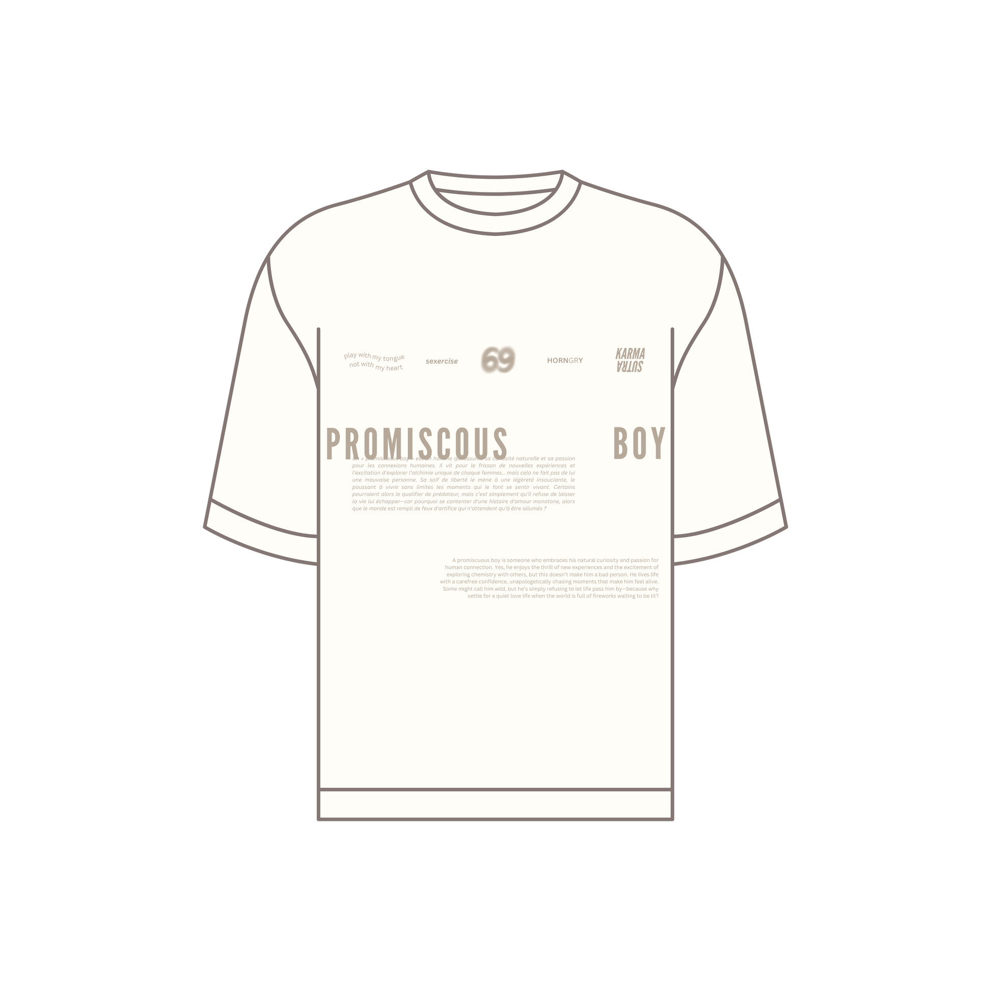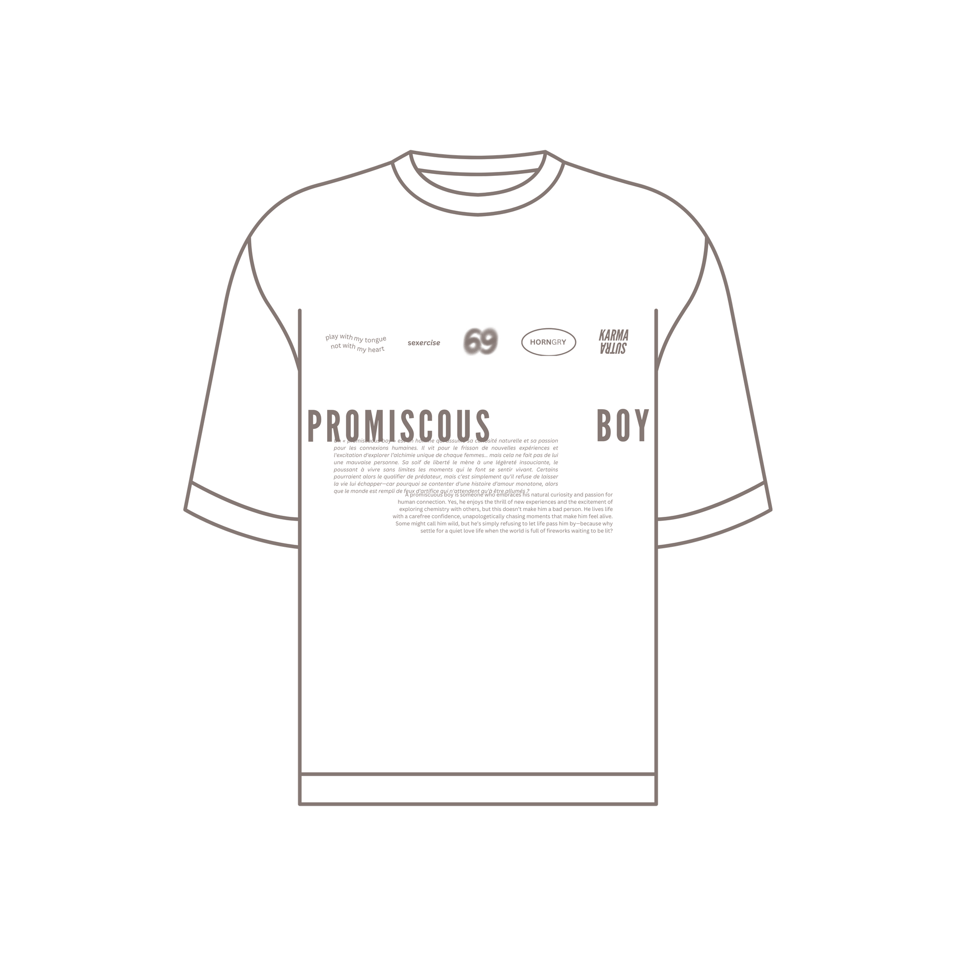 Un « promiscuous boy » est un homme qui assume sa curiosité naturelle et sa passion pour les connexions humaines. Il vit pour le frisson de nouvelles expériences et l'excitation d'explorer l’alchimie unique de chaque femmes… mais cela ne fait pas de lui une mauvaise personne. Sa soif de liberté le mène à une légèreté insouciante, le poussant à vivre sans limites les moments qui le font se sentir vivant. Certains pourraient alors le qualifier de prédateur, mais c’est simplement qu’il refuse de laisser la vie lui échapper—car pourquoi se contenter d'une histoire d’amour monotone, alors que le monde est rempli de feux d'artifice qui n'attendent qu’à être allumés ?